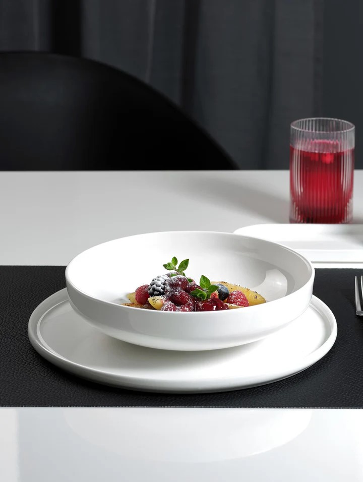 Głęboki talerz A’Table Oco o średnicy 21,5 cm to idealne połączenie minimalistycznego designu i najwyższej jakości wykonania. Wykonany z porcelany Fine Bone China, zachwyca swoją mlecznobiałą barwą, delikatnym połyskiem i subtelną lekkością. Jego harmonijny kształt, inspirowany ideą idealnego koła, jest charakterystyczny dla kolekcji Oco marki ASA Selection, łącząc nowoczesną prostotę z ponadczasową elegancją. To naczynie, które podkreśli charakter każdego dania — od klasycznego spaghetti czy risotto, po świeże sałatki i aromatyczne zupy. Neutralny kolor porcelany stanowi perfekcyjne tło dla barwnych potraw, eksponując ich formę i strukturę w sposób wyjątkowo estetyczny.