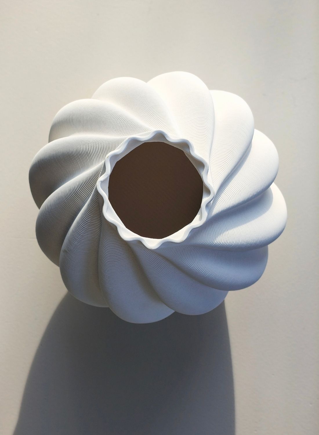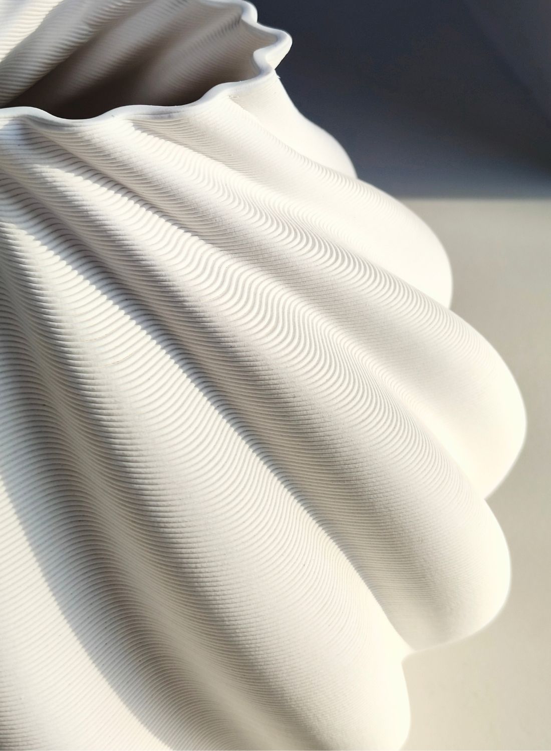 Proces druku 3D pozwala odwzorować dynamiczne kontury, subtelne fale i pękate zaokrąglenia z wyjątkową dokładnością. Efekt przestrzenności i subtelnej gry światła podkreśla artystyczną lekkość formy, nadając wazonowi wyrafinowany charakter. Każdy egzemplarz łączy precyzję wykonania z designerskim pięknem, czyniąc Bonbon zarówno funkcjonalnym elementem do kwiatów, jak i ekskluzywną dekoracją wnętrza, a także znakomitym wyborem na elegancki prezent dla miłośników nowoczesnej ceramiki.