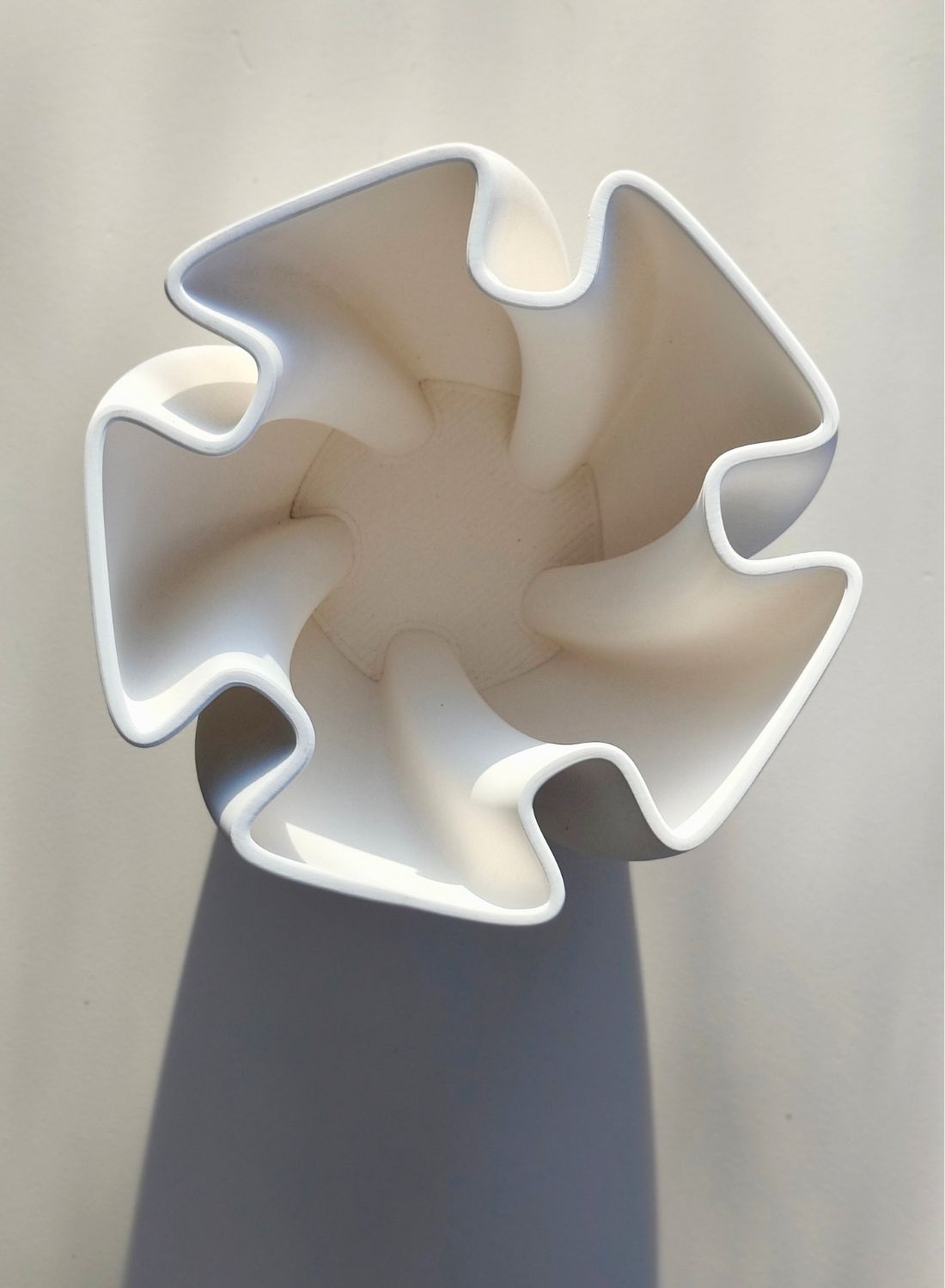 Wazon Pentagoni wykonany jest z ceramiki i powstaje w procesie ręcznym, co sprawia, że każdy egzemplarz jest niepowtarzalny i unikalny. Ceramiczna powierzchnia eksponuje szerokie, faliste fałdy, a proces ręcznego formowania nadaje wazonowi wyrazisty, artystyczny charakter. Kształt wazonu pozwala na tworzenie różnorodnych kompozycji kwiatowych – od pojedynczych gałązek, przez minimalistyczne bukiety, po suszone dekoracje. Dzięki stabilnej konstrukcji wazon sprawdzi się zarówno jako samodzielna dekoracja stołu, konsoli czy komody, jak i jako element większych aranżacji wnętrza. Jego falista forma i biały kolor czynią go także wazonem designerskim, który wprowadza do wnętrz harmonię i elegancję, a jednocześnie stanowi znakomity pomysł na prezent.