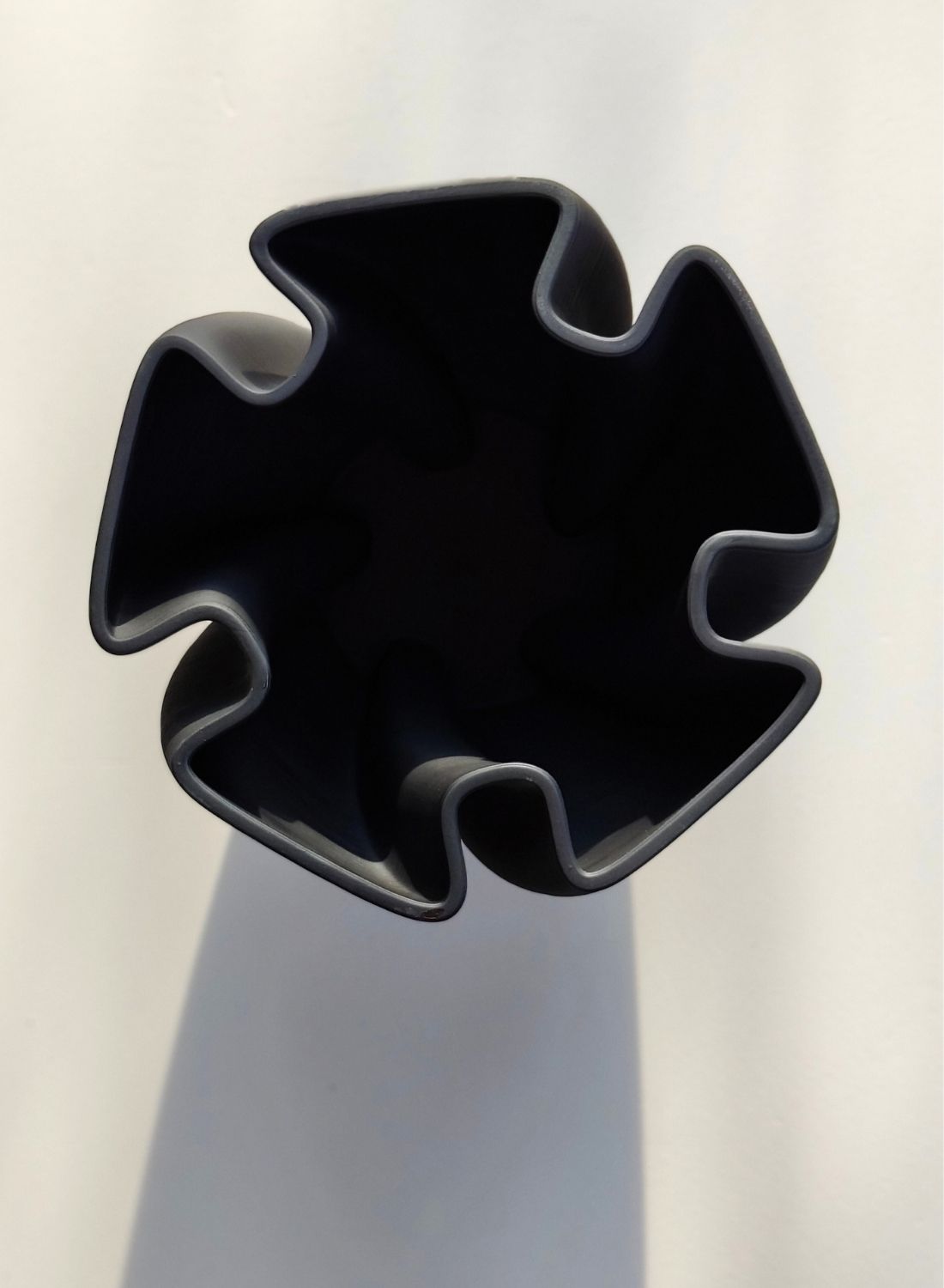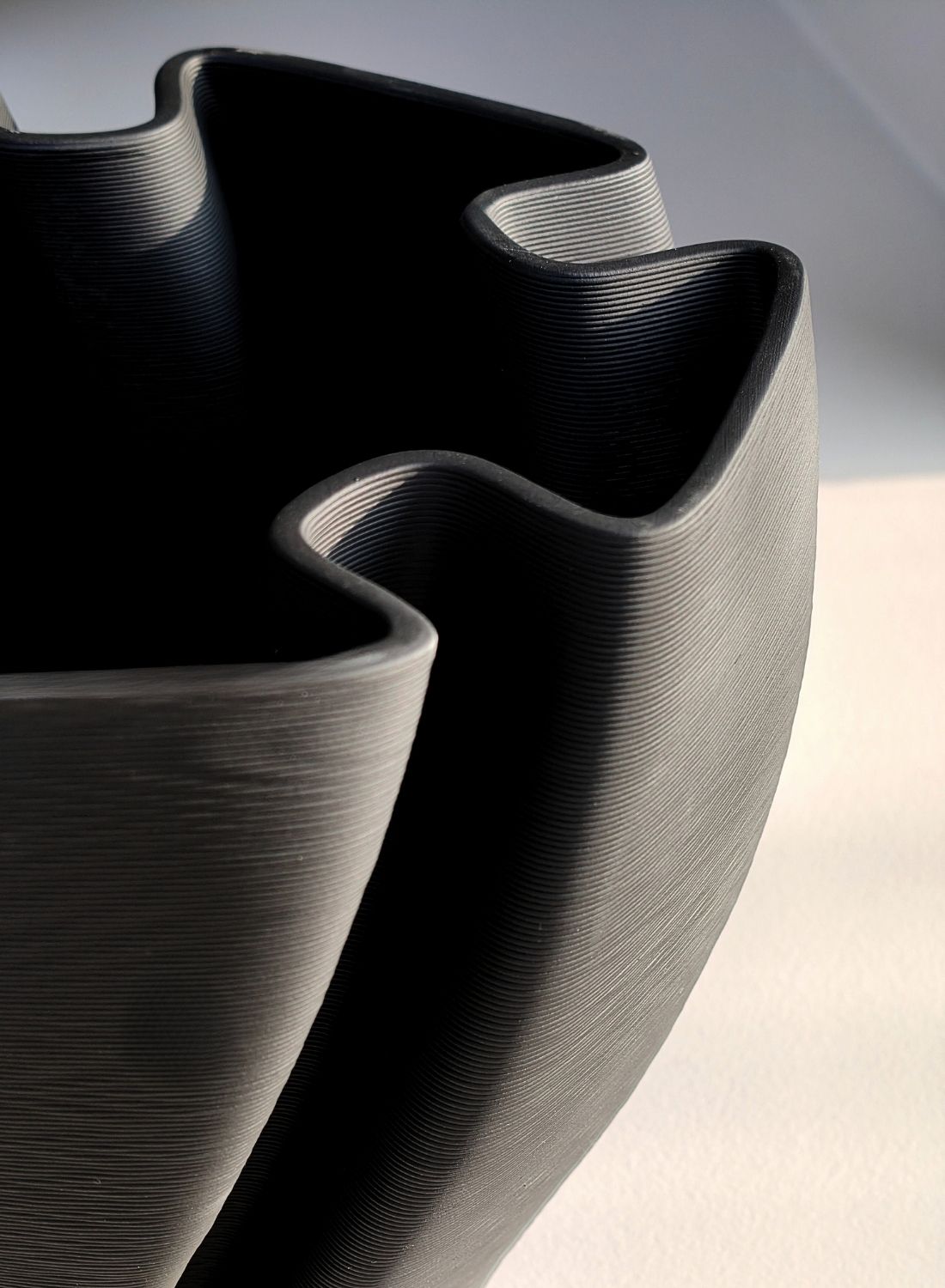 Wazon Pentagoni wykonany jest z ceramiki i powstaje w procesie ręcznym, co sprawia, że każdy egzemplarz jest niepowtarzalny i unikalny. Ceramiczna powierzchnia eksponuje szerokie, faliste fałdy, a proces ręcznego formowania nadaje wazonowi wyrazisty, artystyczny charakter. Kształt wazonu pozwala na tworzenie różnorodnych kompozycji kwiatowych – od pojedynczych gałązek, przez minimalistyczne bukiety, po suszone dekoracje. Dzięki stabilnej konstrukcji wazon sprawdzi się zarówno jako samodzielna dekoracja stołu, konsoli czy komody, jak i jako element większych aranżacji wnętrza. Jego falista forma i głęboki czarny kolor czynią go także wazonem designerskim, który wprowadza do wnętrz harmonię i elegancję, a jednocześnie stanowi znakomity pomysł na prezent.