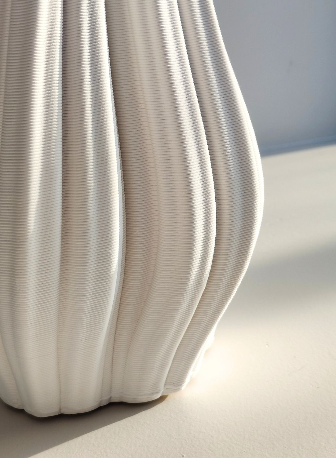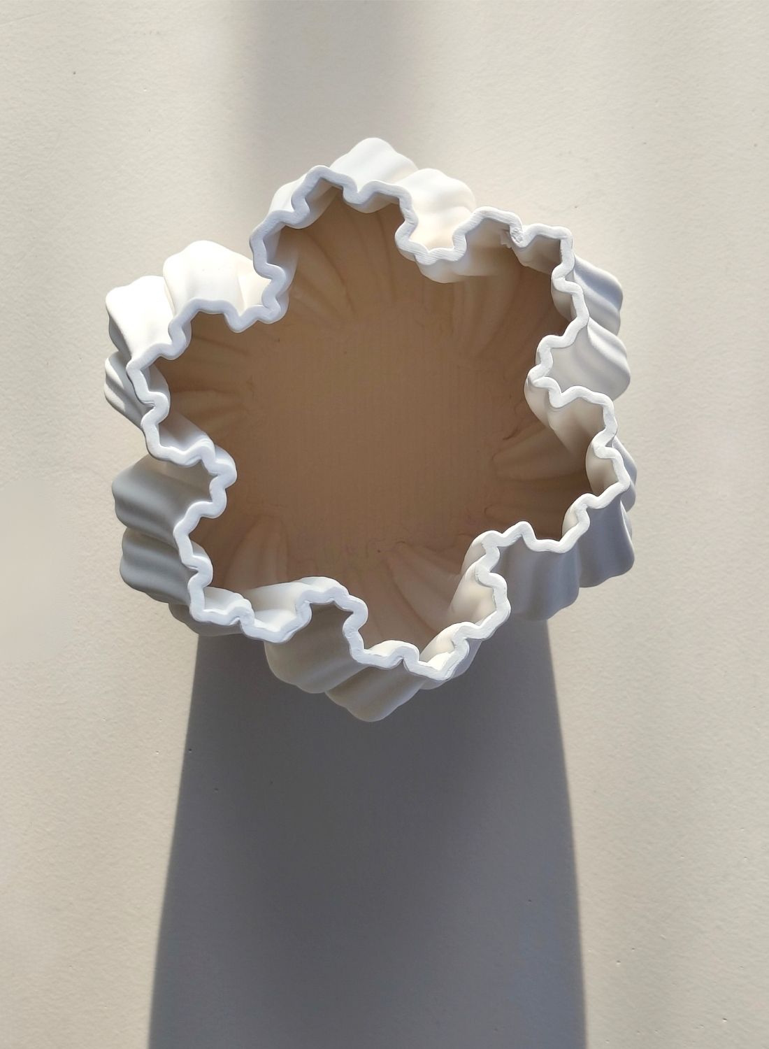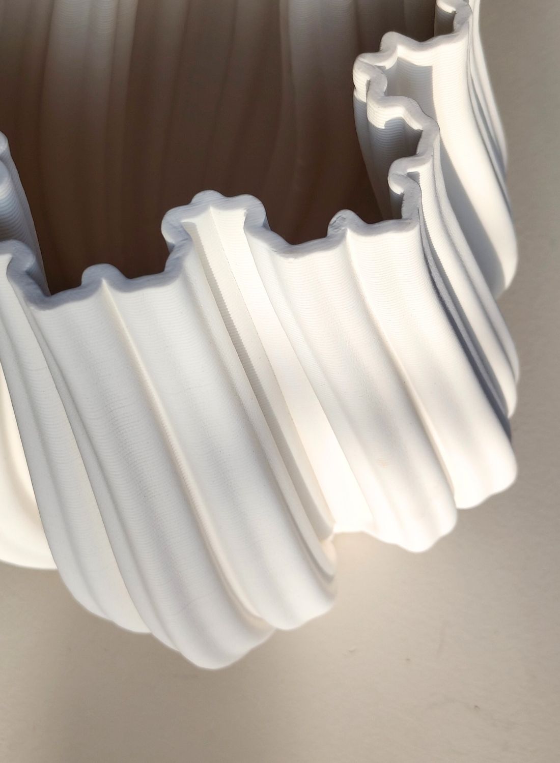 Proces technologii druku 3D pozwala odwzorować faliste linie i nieregularne kontury z wyjątkową dokładnością, tworząc efekt przestrzenności i subtelnej gry światła. Każdy egzemplarz łączy precyzję wykonania z artystycznym pięknem, dzięki czemu wazon Sahara zachwyca dopracowanymi detalami i harmonijną formą. To połączenie nowoczesnej technologii z estetyką ceramiki sprawia, że model ten jest nie tylko funkcjonalnym naczyniem na kwiaty, ale również wyrazistą, designerską dekoracją wnętrza.